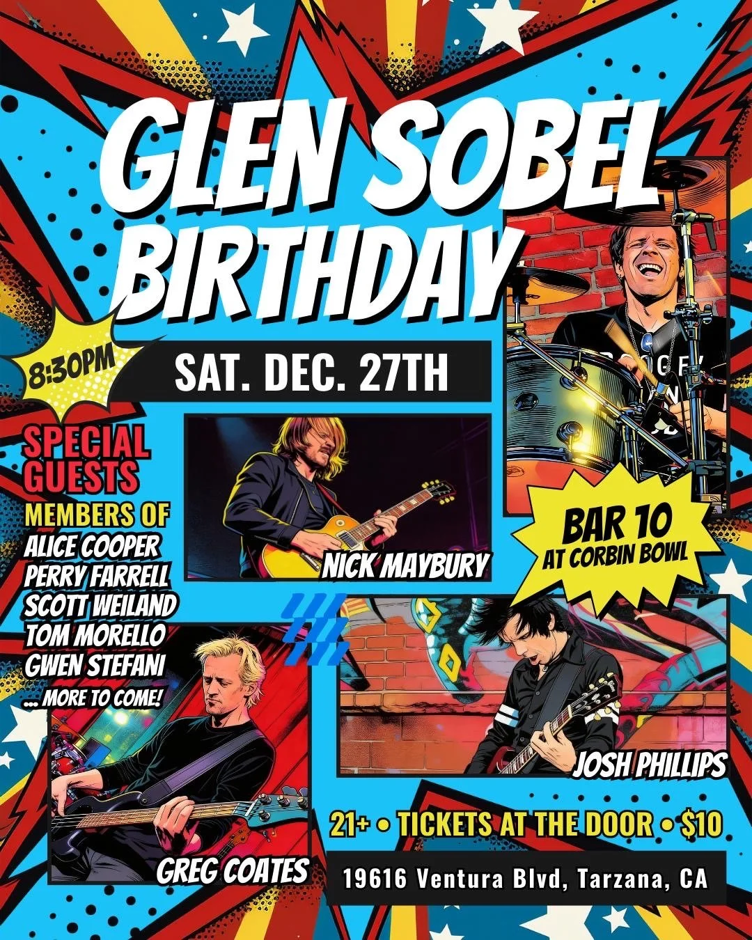 Glen Sobel's Birthday Special with Nick Maybury, Josh Phillips, Greg Coates, and more! Saturday, December 27, 2025 8:30 PM 11:30 PM 20:30 23:30 Corbin Bowl 19616 Ventura Blvd Tarzana United States (map) Google Calendar ICS Glen Sobel's Birthday Special with Nick Maybury, Josh Phillips, Greg Coates, and more!8:30pm$10 at the door18+ Follow BAR 10 for exciting updates, giveaways & more! @BAR10ATCORBIN