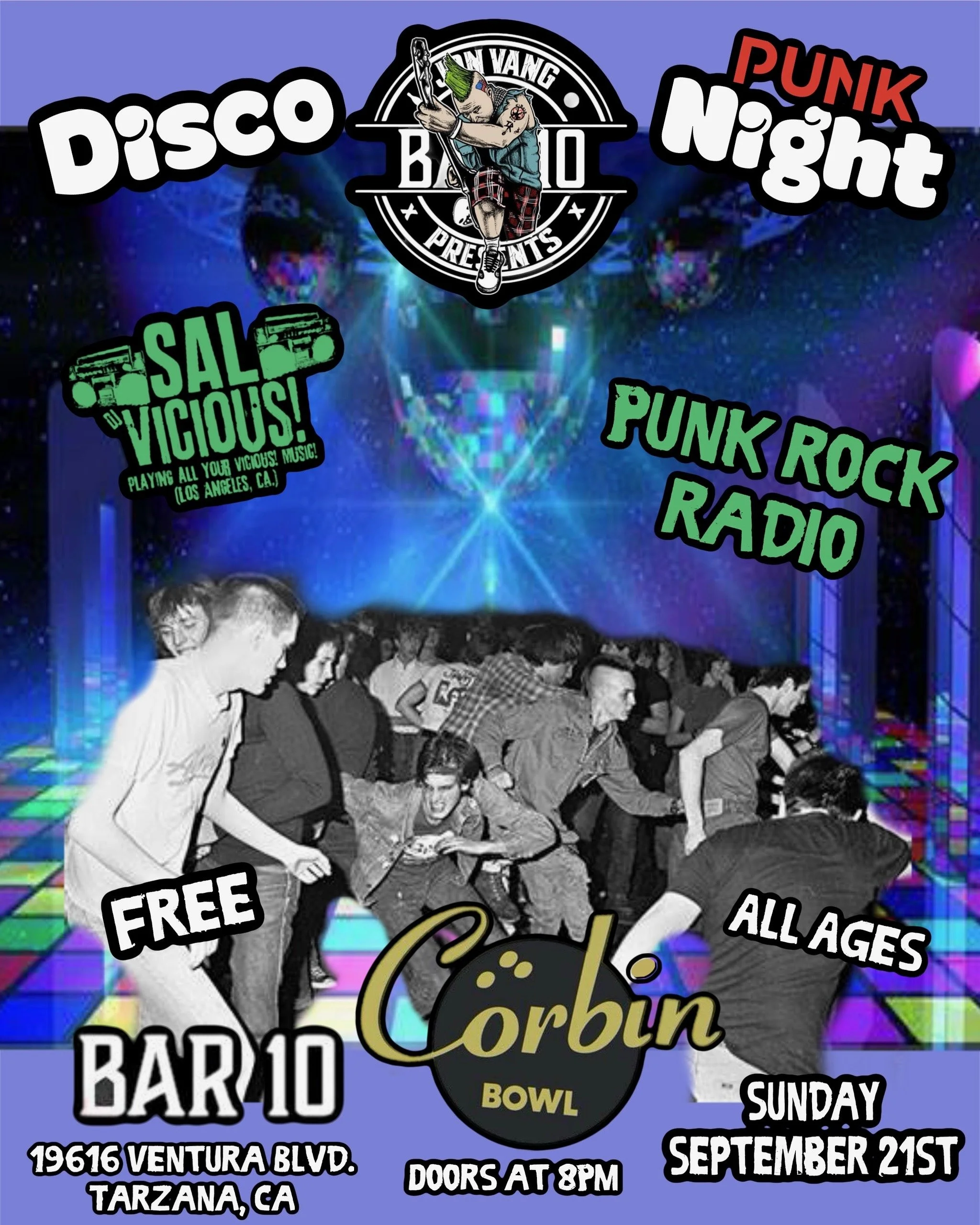 Jon Vang Presents Sal Vicious & Punk Rock Radio Sunday, September 21, 2025 8:00 PM 11:30 PM 20:00 23:30 Corbin Bowl 19616 Ventura Blvd Tarzana United States (map) Google Calendar ICS Jon Vang Presents Jon Vang Presents Sal Vicious & Punk Rock RadioDoors open at 8pmAll agesFree Follow BAR 10 for exciting updates, giveaways & more! @BAR10ATCORBIN