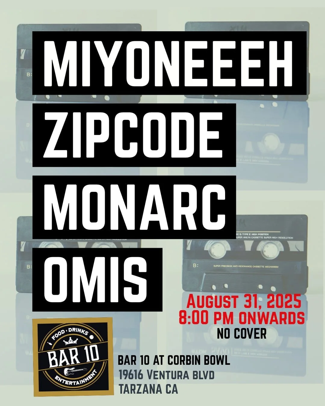 Get ready for a night of music with San Fernando Valley-based bands: Miyoneeeh, Zipcode, Monarc, and Omis