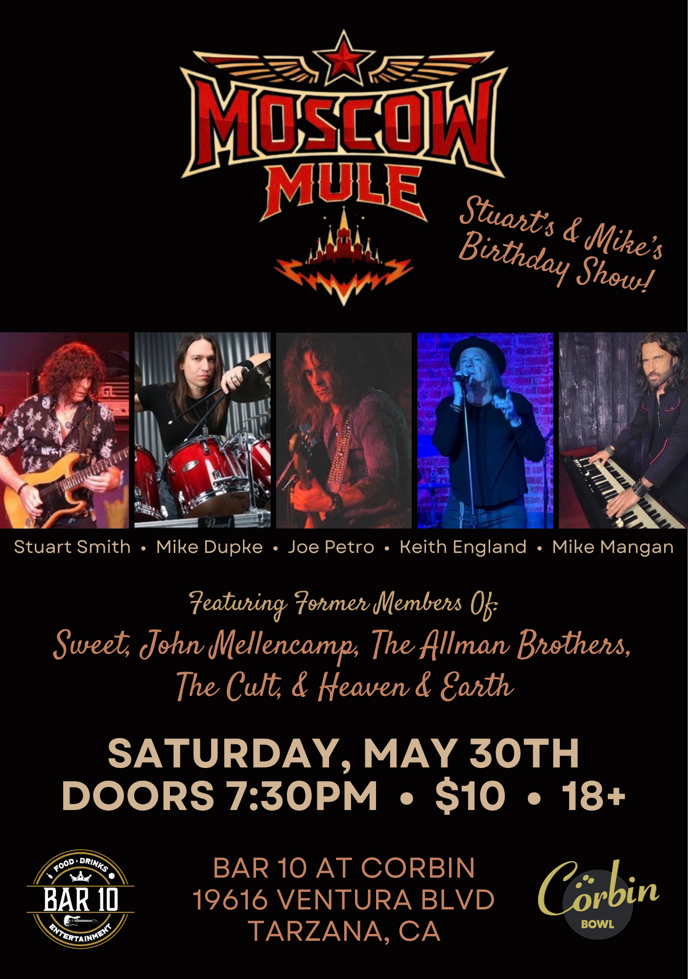 Former members of The Sweet, Allman Brothers, The Cult, Heaven & Earth, and John Mellencamp's band will be performing together as Moscow Mule LIVE on the Bar 10 stage inside the world famous Corbin Bowl! The band promises to play a selection of favorites from the catalogue of the mentioned bands as well as songs from throughout the era of the 70's, 80's and 90's.