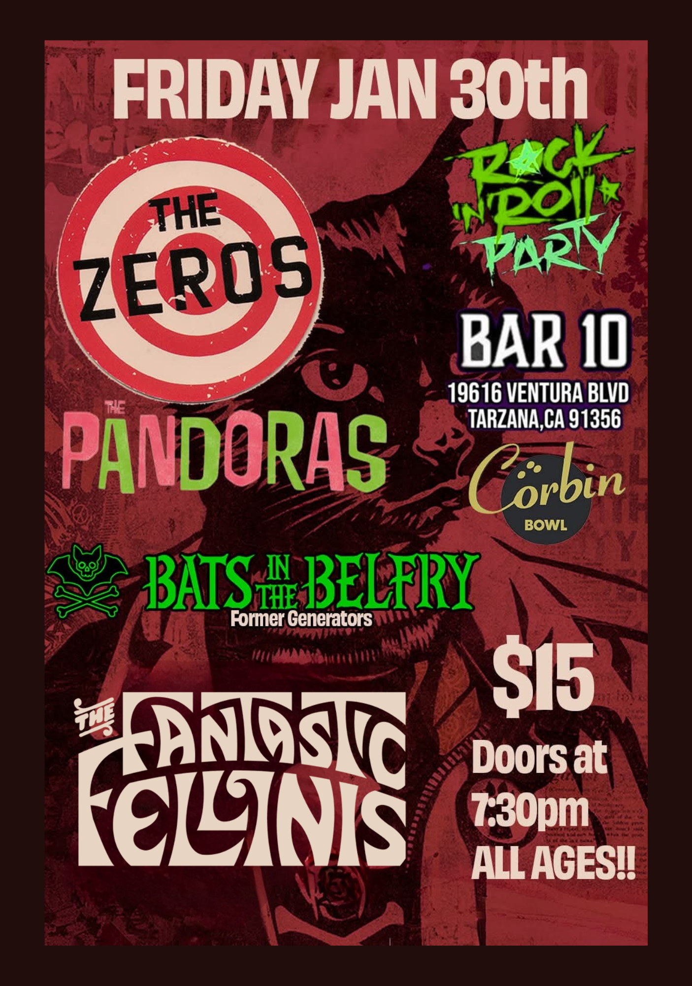 The Zeros, Pandoras, Bats in the Belfry, and The Fantastic Fellinis Friday, January 30, 2026 7:30 PM 11:30 PM 19:30 23:30 Corbin Bowl 19616 Ventura Blvd Tarzana United States (map) Google Calendar ICS The ZerosWith Pandoras, Bats in the Belfry, and The Fantastic FellinisDoors open at 7:30pm$15 coverAll ages GET TICKETS Follow BAR 10 for exciting updates, giveaways & more! @BAR10ATCORBIN